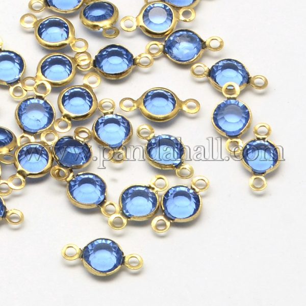 Golden Tone Brass Glass Links/Connectors, Faceted Flat Round, CornflowerBlueSize: about 13mm long, 6~7mm wide, 3mm thick, hole: 2mm.