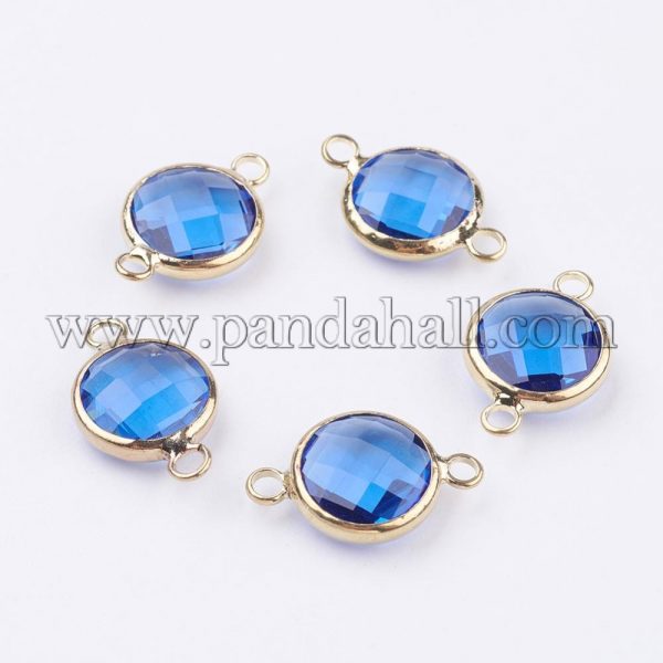 Golden Tone Brass Glass Links/Connectors, Faceted, Flat Round, RoyalBlueSize: about 10.5mm wide, 16mm long, 5mm thick, hole: 1.5mm.