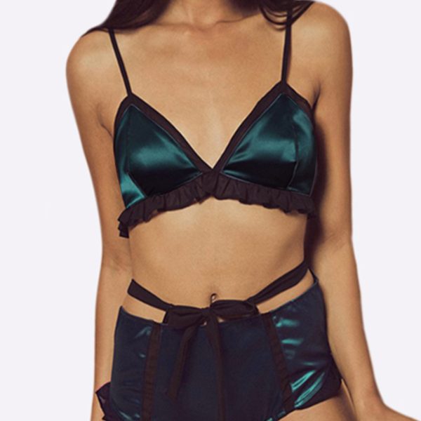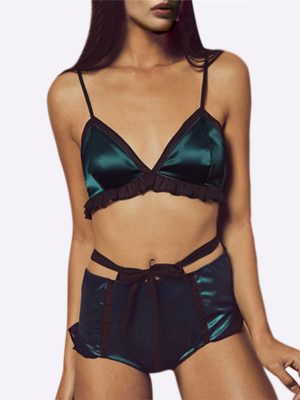 Designed on a soft stretch satin with contrast chiffon organza, the pajama set was made to give you a new comfortable option as well as a luxurious addition. This triangle bra and panty features adjustable straps to compliment your girls. Tie on (and off) with the darling back bow closure for a soft sweet finish. Complete your aqua lounge-set with its pairing hi-waist panty!