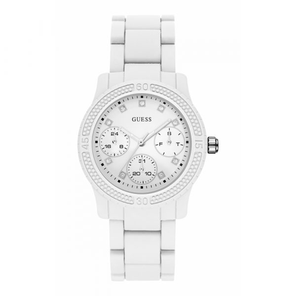 Item Shape – Round Dial Window Material Type – Mineral Crystal Display Type – Analogue Clasp Type – Fold Over Clasp Case Material – Stainless Steel and Resin Case Diameter – 38 millimetres Case Thickness – 13 millimetres Band Material – Stainless Steel Band Length – Ladies Band Colour – White Dial Colour – White Water Pressure Resistance – 30M Warranty Type – Manufacturer Warranty Description – 2 Years Elegant white stainless steel watch. Inside the case sits a white dial , 24 hour sub-dial, date dial and day dial.