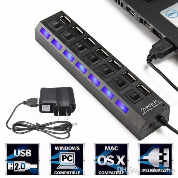 7 Ports LED USB Hub Splitter ON/OFF Switch Adapter Cable Computer Hub USB High Speed USB 2.0 Power Hub for Laptop PC Notebook