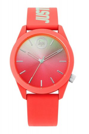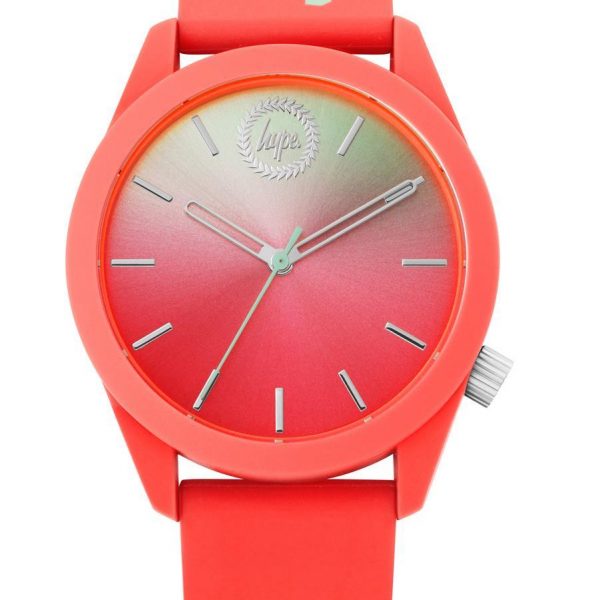 Hype Coral Gradient Justhype Watch (KD36. 15HY) with a Hype Coral Silicone Strap with Coral Case and Coral/Blue Graduated Dial Features: 3 Hands; Mvt: PC21; Case:Coral Plastic; Finish: Soft Touch; Case diameter: 39mm; Glass: Plastic; Dial: Mint/Coral Gradient Sunray Band: Coral, Mint Branding Silicone Strap; WR: 3ATM | Hype Coral Gradient Watch