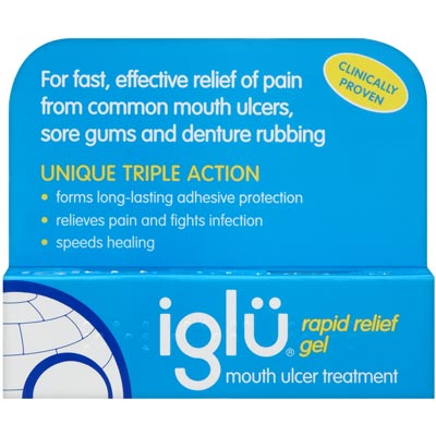 Igl Rapid Relief Gel Igl Rapid Relief Gel is a treatment for fast, effective relief from the pain of common mouth ulcers, sore gums and denture rubbing. Suitable for adults and children over 7 years, it works in three ways:It forms a gel coating to protect the sensitive and delicate area of the mouth lining as it heals.It contains lidocaine hydrochloride, a local anaesthetic to stop the pain.It contains aminoacridine hydrochloride, an antiseptic to prevent infection.