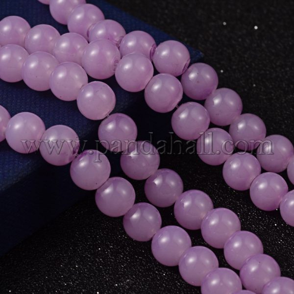 Imitation Jade Glass Beads Strands, Spray Painted, Round, VioletSize: about 8mm in diameter, hole: 1.3~1.6mm; about 100pcs/strand, 31.4″.Glass beads are shining and fascinating. Imitated jade effect makes these beads look more charming and fashionable. It can be matched with hooks, jumprings, and pins to be necklaces, bracelets and so on.