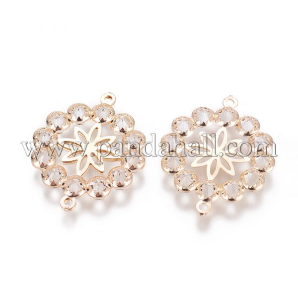 Iron Links/Connectors, with Glass, Flower, Clear, Light Gold, 36x46x6mm, Hole: 1.8mm