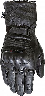 Long cuff with large strap Elasticated wrist with tightening strap Flex on fingers Rain wiper on index Index compatible with touch screens Inner lining in soft micropolar on palm side, velvety polar on back of hand
