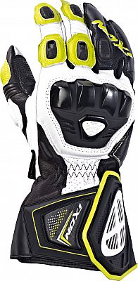 Goat leather Cow leather and kangaroo leather on palm side with Kevlar® thread Kevlar® lining with glued polyester jersey Exclusive vented knuckle protector on backhand Rubber reinforcement on cuff Sliders on side of palm Pisiform and scaphoïde reinforcements Rubber reinforcements with vents incrusted over fingers and on side of little finger Precurved fingers and palm Flex leather over fingers, stretch nylon between fingers Wrist tightening with buckle, Velcro, and rubber strap Long cuff with double Velcro tightening