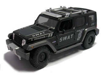 This Jeep Rescue Concept Dirt Rider Diecast Model Car is Black and features working steering, suspension, wheels and also opening bonnet with engine, doors, tailgate. It is made by Maisto and is 1:18 scale (approx. 26cm / 10.2in long).