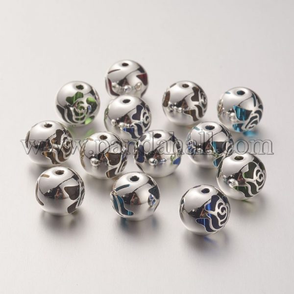 K9 Glass Beads, Covered with Brass, Round with Rose Pattern, 925 Sterling Silver Plated, Mixed ColorSize: about 10.2mm in diameter, 9.2mm thick, hole: 1.5mm.The inner core of bead is K9 glass, and a layer of brass is wrapped on the outside, and then electroplate it.