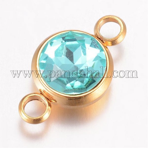 K9 Glass Links, Faceted, with 304 Stainless Steel Findings, Flat Round, Golden, AquamarineSize: about 10mm wide, 17.5mm long, 6.5mm thick, hole: 2.5mm.