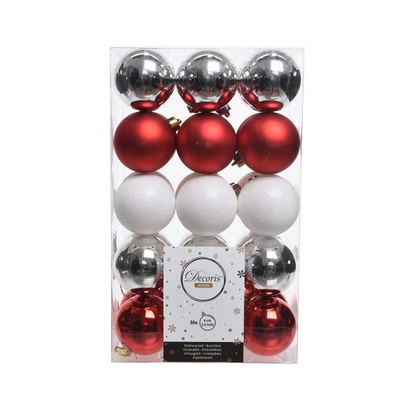 The Kaemingk – December to Remember Set of 30 Assorted Shatterproof Baubles is a large mixed bauble collection ideal for those wishing to decorate their Christmas tree in traditional and vibrant Christmas colours. This great bauble collection is part of our enjoyable December to Remember Christmas theme and combines a mix of baubles in dark shiny silver, shiny Christmas red, glitter white, matt Christmas red, and light shiny silver. With 6 round baubles in each colour, this assorted mix is made from a shatterproof material, perfect for all ages to get involved with decorating the tree. Each bauble measures at 6cm in diameter, making them an ideal size for both small and large trees. The set of 30 baubles will arrive in a handy transparent box that can be used to store the baubles away again once Christmas is over. Set Includes:6 x Dark Shiny Silver Round Baubles6 x Shiny Christmas Red Round Baubles6 x Glitter White Baubles6 x Matt Christmas Red Round Baubles6 x Light Shiny Silver Round Baubles.