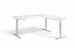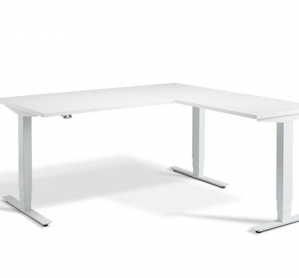 Lavoro Advance Height Adjustable Corner Desk- White Frame- 1800 x 1600mm- White finish The Advance desk from Lavoro Design is an ideal choice for the office or home office. This corner desk features a sturdy and high quality height adjustment triple motor system, with anti-collision motors and many accessory options. With the largest height variation in the Lavoro range from 640mm-1300mm making it ideal for any environment. This means that not only can the user adjust from sitting to standing as they please- which is said to promote health and productivity in the workplace- the desk is fully adjustable for inclusivity of all employees needs. The Advance range is wheelchair accessible. Made from high grade steel, the Advance adjustable desk has a 160 KG max load weight and is available in a range of 9 table top finishes and additional frame colour options.