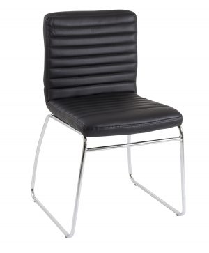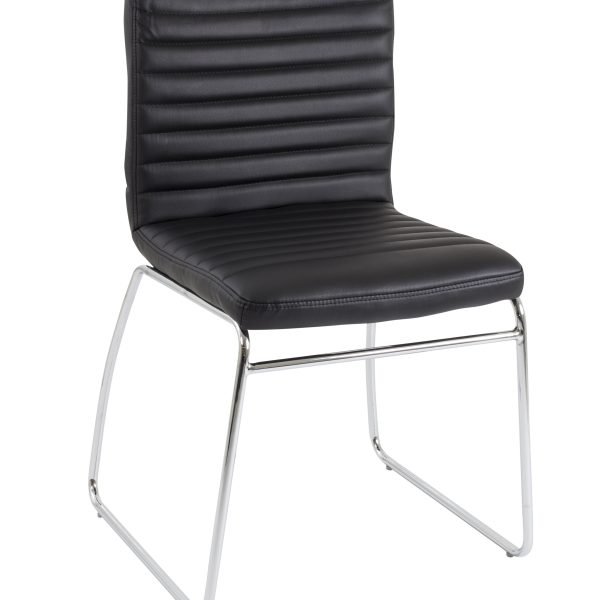 A leather look, chrome framed visitor chair. Stacks 4 high for convenient storage.Features Include :Generously cushioned meeting room chairUpholstered in soft touch, leather look, materialStylish stitching detailContemporary, chrome skid frameStackable up to 4 high for easy storageConforms to BS 1335 (2000) Part 2Suitable for users up to 115 kgAvailable in black leather-look