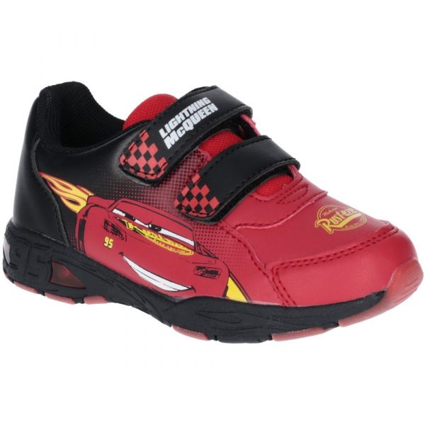 ., Official Disney Pixar Cars boys trainers. Lights up with every step., Dual adjustable touch-fasten straps. Fun chequered flag prints on the straps., Padded collar and flexible cushioned tongue. Lightning McQueen action print on side., Soft textile lining and EVA foam foot bed. Chasing flashing lights at heel., Energy rebounding heel. Lightweight and flexible TPR sole.