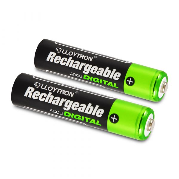 With these AAA rechargeable batteries you can save money and do your bit for the environment because they can be recharged up to 1,000 TIMES – unlike single use disposable batteries.With a 550mAh capacity, these batteries are suitable for a wide range of battery powered devices – including digital cameras, MP3 players, toys, LED torches, radios, remote controls and also Panasonic and BT cordless DECT phones etc.Specifications Size: AAA NiMH rechargeable Capacity: 550mAh Charge up to 1,000 times Manufacturer warranty: 1 yearWhat’s included2 x Lloytron AAA LR03 Ni-Mh Rechargeable Batteries 550mAh – split retail blister pack