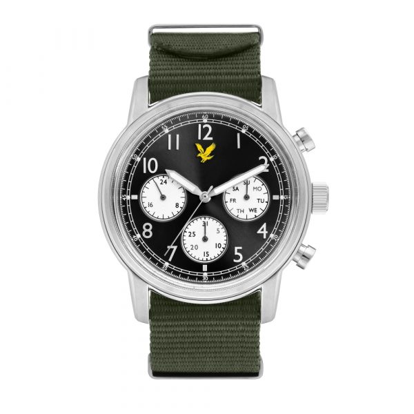 Item No. LS600502268 MOVEMENT : Japan Epson#VX9J (6 Hands QA Multi-function, 24 hour/Date and Day) CASE MATERIAL : Stainless Steel CASE DIAMETER (mm) : 42.0 CASE COLOUR : Stainless Steel DIAL COLOUR : Black with Silver Sub-dials FEATURES : Day and date on sub-dials BAND : Nylon Nato Strap BAND COLOUR : Green WATER RESISTANCE : 5 ATM