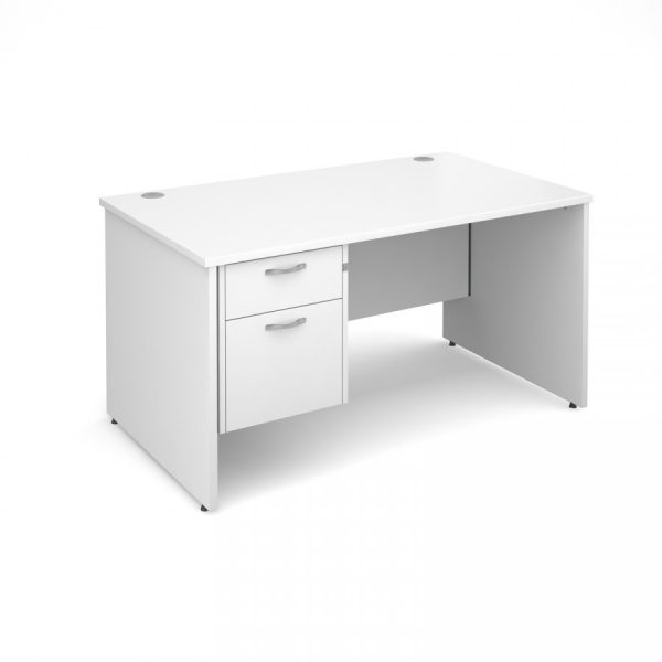 Maestro Panel End Office Desk with Single Pedestal- 1400mm- White The Maestro desk is designed for purpose, style and affordability. This office desk is ideal for your office, home office or study. With a wide range of styles, sizes and finishes, this desk is recommended for any size of office, and can be bought as a single unit or as part of a larger cluster. This model features a pedestal which can be fixed to either the left or right hand sideduring assembly. Features Of the Maestro Office Desk Desktop features two cable access ports Stylish panel ends with a white finish Single pedestal with a choice of 2 or 3 drawers Also available in Oak, Beech, Maple and Walnut Create single hot desks or large clusters Choice of matching storage to complement the range Supplied flat packed for easy home assembly