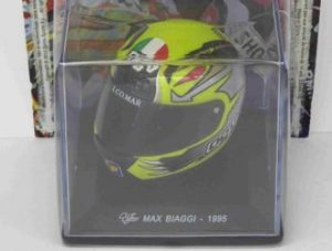This Max Biaggi World Champion Replica Helmet (Max Biaggi – MotoGP250 1995) has working visor and also comes in a display case. It is made by Ex Mag and is 1:5 scale.