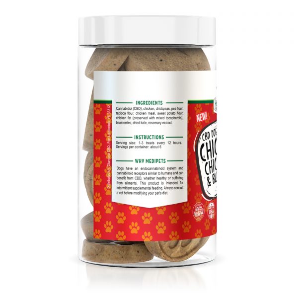 MediPets CBD Dog Treats Chicken, Chickpea & Blueberry Biscuits feature over 16mg of CBD (cannabidiol) per treat. These CBD dog treats are sourced from industrial hemp and made in the USA.Give your dog MediPets CBD Dog Treats Chicken, Chickpea & Blueberry Biscuits, the CBD pet treats designed to make your pet’s mouth water. These chicken, chickpea & blueberry flavored CBD dog treats feature high quality CBD hemp oil and natural ingredients like chickpeas, sweet potatoes and blueberries.This product is intended for intermittent supplemental feeding. Always consult a vet before modifying your pet’s diet.