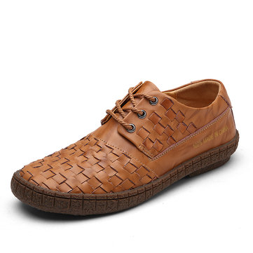 Men Genuine Leather Breathable Knitted Lace Up Casual Shoes