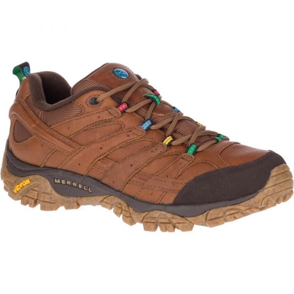 Go trekking or hiking in these Merrell Men’s Moab 2 Earth Day Walking Shoes. Made of sustainably-sourced materials they have a full grain leather upper for protection against abrasion. Their webbing loops ensure secure lacing while the bellows tongue keeps debris and dirt out. They are equipped with Merrell air cushion in the heel for shock absorption and stability., Sustainably sourced materials. Full grain leather upper. Webbing lopps for secure lacing ., Bellows tongue keeps debris out. Breathable mesh lining. Protective rubber toe cap., Merrell Air Cushion in the heel absorbs shock and adds stability . Artist collaboration Merrell Kinetic Fit BASE removable contoured footbed for flexible support . Recycled compression molded EVA midsole for stability and comfort, Vibram EcoDura recycled outsole. 5 mm lug depth.,
