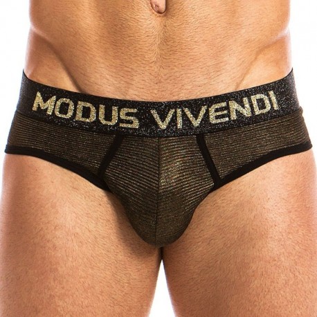Low-rise brief made from shiny pleated microfiber. Shiny elastic waistband with Modus Vivendi gold lettering. Made in Greece.