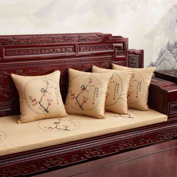 New Chinese solid wood cotton linen embroidery sofa chair removable washable anti slip thickened sponge cushion