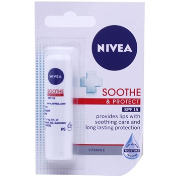 Nivea Lip Care Sooth & Protect 4.8gNivea Soothe & Protect SPF 15 Lip Balm contains Hydra IQ and Vitamin E which effectively protects lips from drying out providing long lasting care. For lips that feel soft and smooth and look healthy. Soothes dry lips and prevents further dryness.Provides intensive care and long lasting moisture.Contains SPF15 providing protection against UVA and UVB rays.IngredientsCera Microcristallina, Octyldodecanol, Hydrogenated Polydecene, Ricinus Communis Seed Oil, Cetyl Palmitate, Ethylhexyl Methoxycinnamate, Myristyl Myristate, Polyglyceryl-3 Diisostearate, Cetearyl Alcohol, Bis-Diglyceryl Polyacyladipate-2, Panthenol, C20-40 Alkyl Stearate, Glycerin, Cera Carnauba, Butyl Methoxydibenzoylmethane, Butyrospermum Parkii Butter, Simmondsia Chinensis Oil, Tocopheryl Acetate, Tocopherol, Bisabolol, Vitis Vinifera Seed Oil, Triticum Vulgare, Cera Alba, Zea Mays, Aqua, BHT, Benzyl Alcohol, Benzyl Benzoate, Citral, Hexyl Cinnamal, Hydroxycitronellal, Parfum, CI 40800.