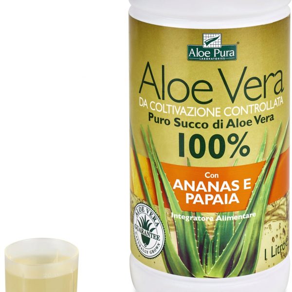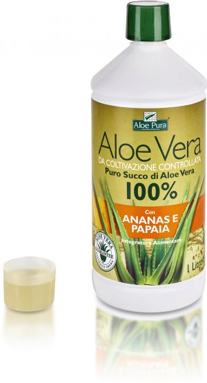 Delightfully delicious flavour Optima Naturals has created a 100% pure aloe vera juice, whereby the aloe vera comes from organic cultivation. The juice is obtained directly from the fresh plants that are aged for at least 5 years. The unfiltered gel of the leaves is used to obtain juice. The product is cold-pressed and does not contain any aloin, water, dyes or alcohol. Pineapple and papaya extracts lend the juice a fruity flavour. Suggested Use: Drink 25 ml of aloe vera juice undiluted or diluted with some water – twice a day. After opening, store in the refrigerator and use within 2 months. Ingredients per daily dosage Aloe (Aloe Barbadensis) Gel and whole leaf, juice 50 ml Pineapple and papaya extracts 10 ml Ingredients: Aloe Vera (Aloe barbadensis Miller) juice from whole leaf, Aloe Vera (Aloe barbadensis Miller) gel, Papaya fruit juice concentrate (Carica papaya L), fructose, fruit juice concentrate from pineapple (Ananas comosus L.MERR). Antioxidants: ascorbic acid, citric acid. Pineapple aroma. Preservatives: potassium sorbate, sodium benzoate