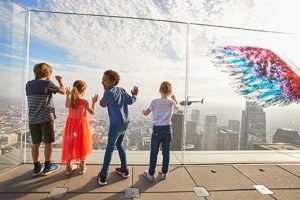 OUE Skyspace LA boasts a thrill experience unlike any other: Skyslide, an outdoor glass slide, positioned nearly 1,000 feet above downtown Los Angeles. The Skyslide is forty-five feet long, approximately 4 feet wide and made entirely with 1-1/4 inches thick glass. Visitors will experience Skyslide’s unparalleled views in a whole new way as they glide from the 70th to the 69th floor of the U.S. Bank Tower.  *Additional Charge applies.