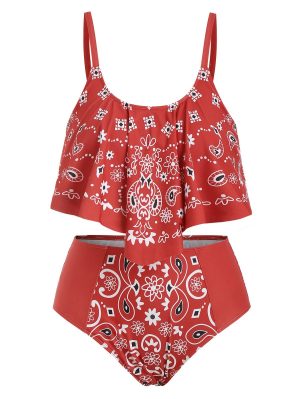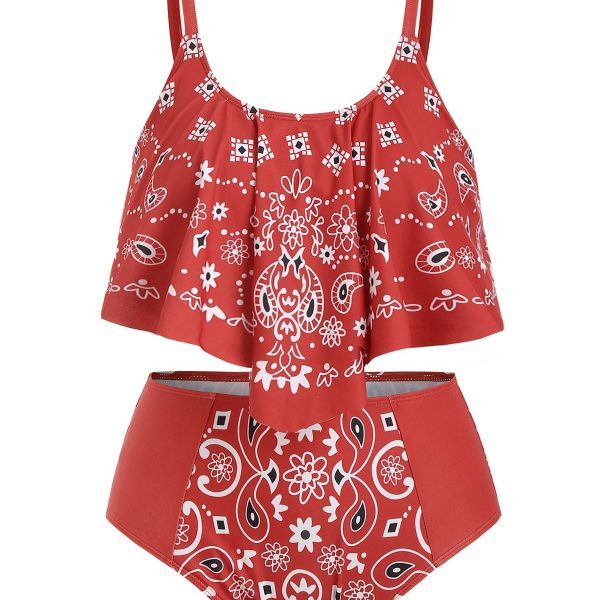 Overlay Ruffles Paisley Printed Plus Size Tankini Set