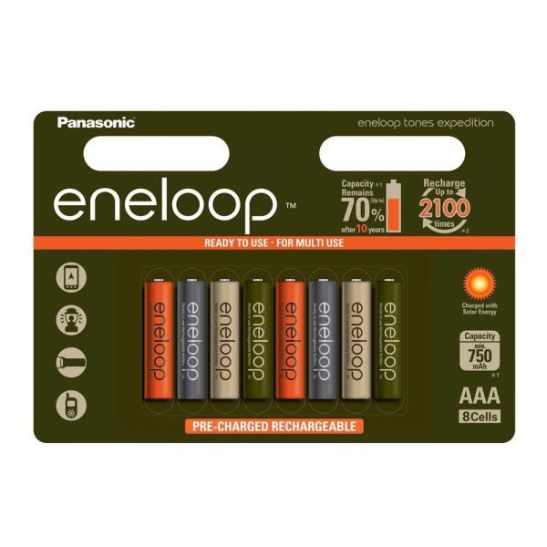 Eneloop is Panasonic’s ‘green’ rechargeable battery, now available in a new limited edition Expedition pack. The batteries can be recharged up to 2100 times, last longer than alkaline batteries and perform better at low temperatures (as low as -20°C). Furthermore, they supply energy for longer than traditional Ni-MH batteries. Traditional Ni-MH batteries fail to work once the voltage drops below 1.1 volts, whereas Panasonic Eneloop batteries keep the voltage level over 1,1 volts for a longer time. eneloop uses energy from the sun and envisions sustainable Clean Energy Lifestyle by encouraging repeated use. The Eneloop Expedition batteries are perfect for navigation systems, lanterns, torch lights and transceivers, TV remotes, toys etc. etc.SpecificationsLimited “Expedition” Colour Edition Can be recharged up to 2100 timesReady to use even after 10 years of storage Pre-charged by solar energy Higher usable capacity than standard batteries Superior discharge at low temperature Voltage: 1.2V Typical capacity: 800mAh Minimum capacity: 750mah Chemistry: Ni-MH (superior Nickel Metal Hydride)Note * After 10 years capacity remains at 70%