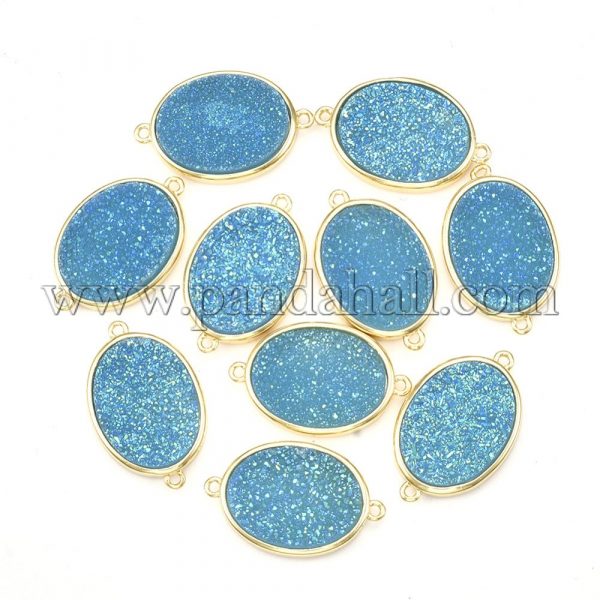 Plating AB Natural Druzy Agate Links/Connectors, with Brass Findings, Dyed, Oval, Golden, DeepSkyBlueSize: about 22mm long, 14mm wide, 4mm thick, hole: 1mm.