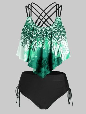 Plus Size Printed Strappy Drawstring Tankini Swimwear