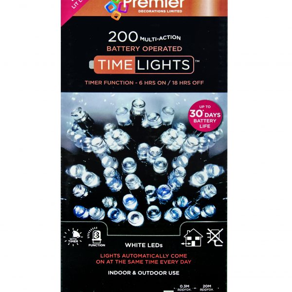 200 Multi Action Battery Operated White LED lights with timer. Suitable for indoor and outdoor use. 6 hours on 18 hours off.