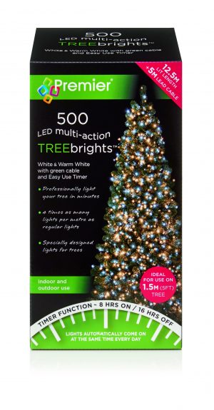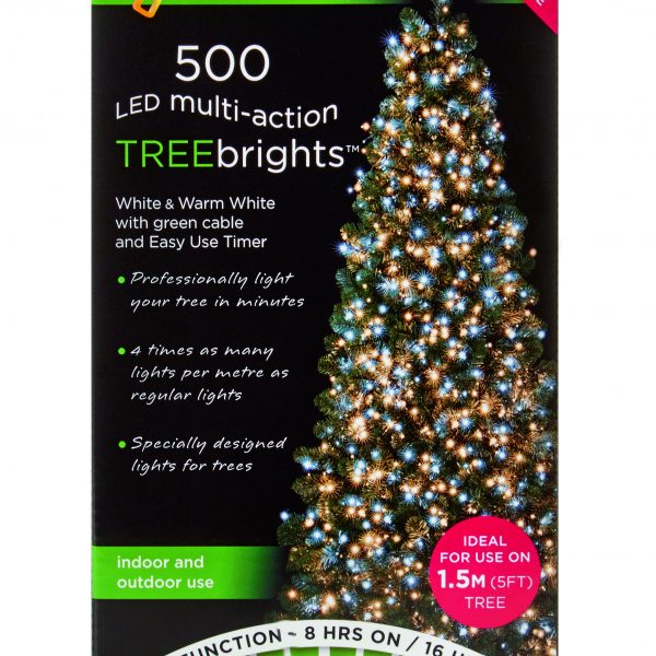 Treebrights for indoor and outdoor use. 500 White and Warm White Mix LEDs with timer and green cable. 12.5M lit length + 5M lead cable.