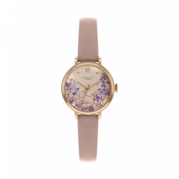 Radley women’s watch with a rose gold tone stainless steel case. Silver tone dial with a floral motif. Finished with a pink leather strap. The brand’s iconic dog is also on the dial