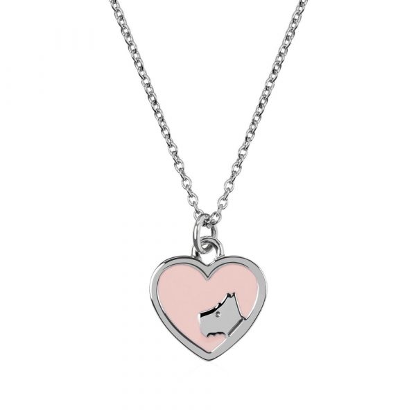 Pendant approx 12mm in width Material – Rhodium Plated Sterling Silver Pink Enamel Radley Dog’s Head Silver Necklace features an enamelled heart shaped pendant. Rhodium plated, adjustable sterling silver chain measures between 17″ and 18.5″