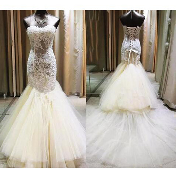 Real Picture Elegant Mermaid Lace Wedding Dresses Strapless Sweep Train Wedding Gowns Plus Size Beach robes de mariée