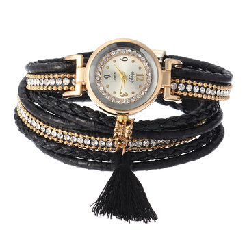 Fashion Rhinestone Multilayer Leather Strap Women’s Watch with Tassel Pendant Bracelet Wrist Watch