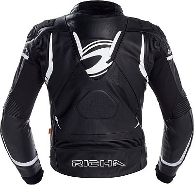 Combination of top quality cow & goat skin leather Full and semi-perforated leather Comfort stretch for ergonomic fitting D3O elbows & shoulder protectors EN1621-1:2011 (Level 1) D3O back protector in accordance with the norm prEN1621-2:2011(Level 1) Outside shoulder cap as extra protection layer Racing hump on the upper back for optimal aerodynamics and neck support Soft neoprene collar for extra comfort 2 outside & 2 inside pockets Safety stitching in high risk zones Ergonomic race fitting Adjustable position of the elbow protectors Long connection zipper matches with Richa trousers eg. Mugello trousers Waist adjustment (press buttons) To connect to a Richa motorcycle jeans, you can use the belt jacket connector
