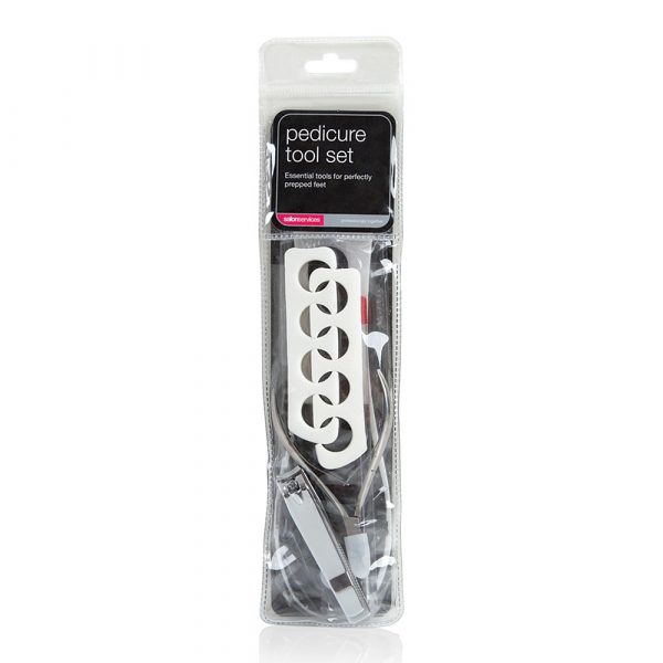 essential set of pedicure tools ideal for salon or home use contains everything needed for the perfect pedicure includes 100 grit file, paddle foot file, toe nail clipper, cuticle nipper, hoof stick, and toe separators