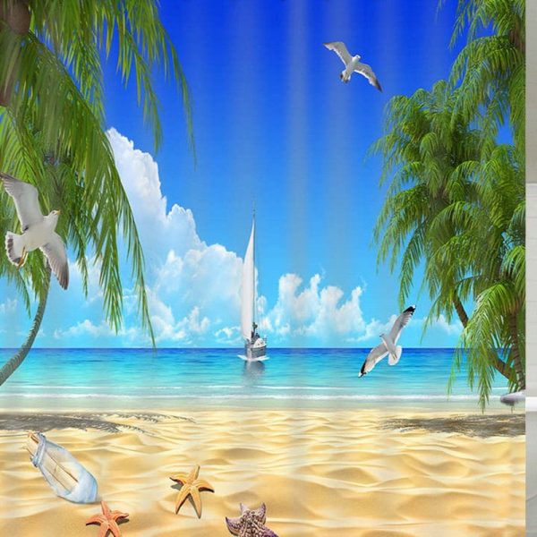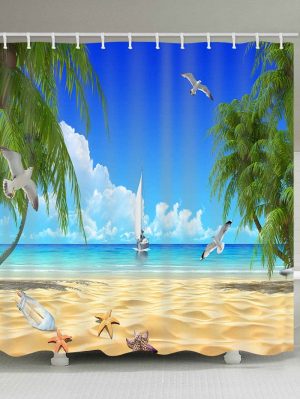 Seaside Trees Birds Print Waterproof Bathroom Shower Curtain