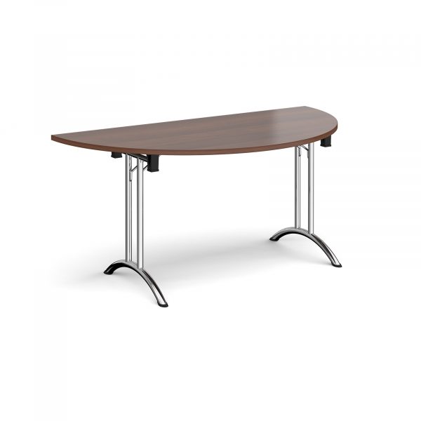 Semi circular folding leg table with chrome legs and curved foot rails 1600mm x 800mm – walnutCurved folding leg tables combine stylish good looks with versatility and are ideal for use in meeting rooms, conference suites and exhibitions. When folded, the tables stack together neatly for easy storage. The frame design also offers sufficient leg room for users when sat around the tables, and can be used stand-alone or together with the trapezoidal and semi-circular tables to create your desired layout.Features Include :Semi circular tables 800mm deep with folding steel frame and legsFolding frame for easy handling and storage when not in useTable tops available in beech, oak, maple, white and walnutLeg frames with curved foot rails available in chrome, silver, black and whiteVersatile tables are available in a variety of shapes and sizes to suit any meeting room25mm scratch resistant tops with impact resistant, rigid plastic ABS edging
