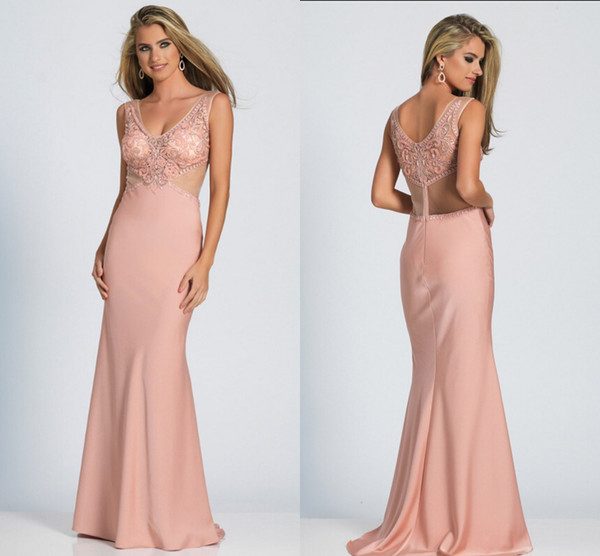Sexy Blush Pink Vintage Prom Dresses V Neck Sleeveless Crystal Beaded Elastic Satin Long Mermaid Formal Dresses Evening Wear Cheap