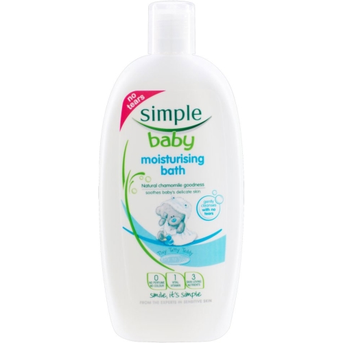 Simple Baby Moisturising BathSimple Baby Moisturising Bath gently cleanses, soothes and moisturises your baby’s delicate sensitive skin. The special blend of natural plant oils and moisturising goodness contains chamomile, lavender, glycerin and pro-vitamin B5 is so gentle it is suitable for newborns. It contains no artificial perfume or colour or other unnecessary ingredients and the hypoallergenic, no tears, pH balanced, soap free formula has been dermatologically and paediatrian tested so you can be sure that it is safe for your little one and won’t upset their skin.
