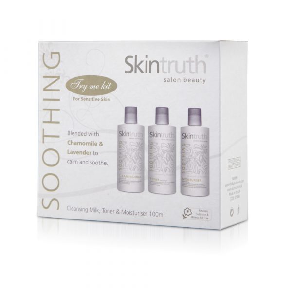 soothing range ideal for sensitive skin types great to retail in salon great for travelling no parabens, sulphates or mineral oil contains 1 x soothing cleanser 100ml, 1 x soothing toner 100ml & 1 x soothing moisturiser 100ml