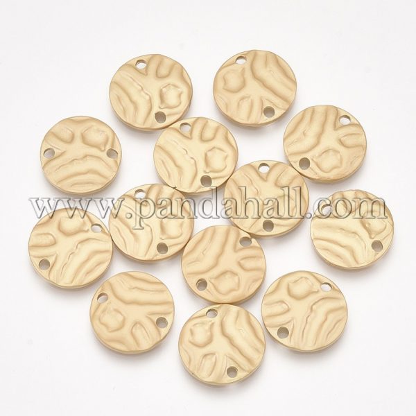 Smooth Surface Alloy Links/Connectors, Hammered, Flat Round, Matte Gold ColorSize: about 15mm in diameter, 2.5mm thick, hole: 1.8mm.This product is plated with matte gold color firstly, in order to avoid scratching, the surface is sealed with glaze finally, so it’s surface is smooth.