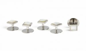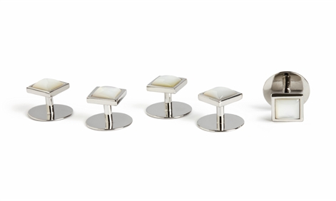 A set of five formal dress studs in square format with a generous inlay of real hand cut mother of pearl. The dress studs come in their own high quality branded presentation box.