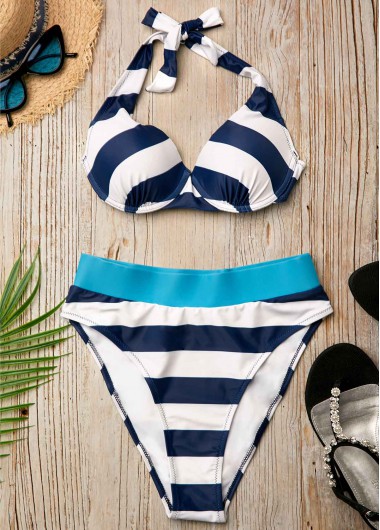 Striped Navy Blue High Waist Two Piece Bikini FREE Shipping & 30 Days Easy Return